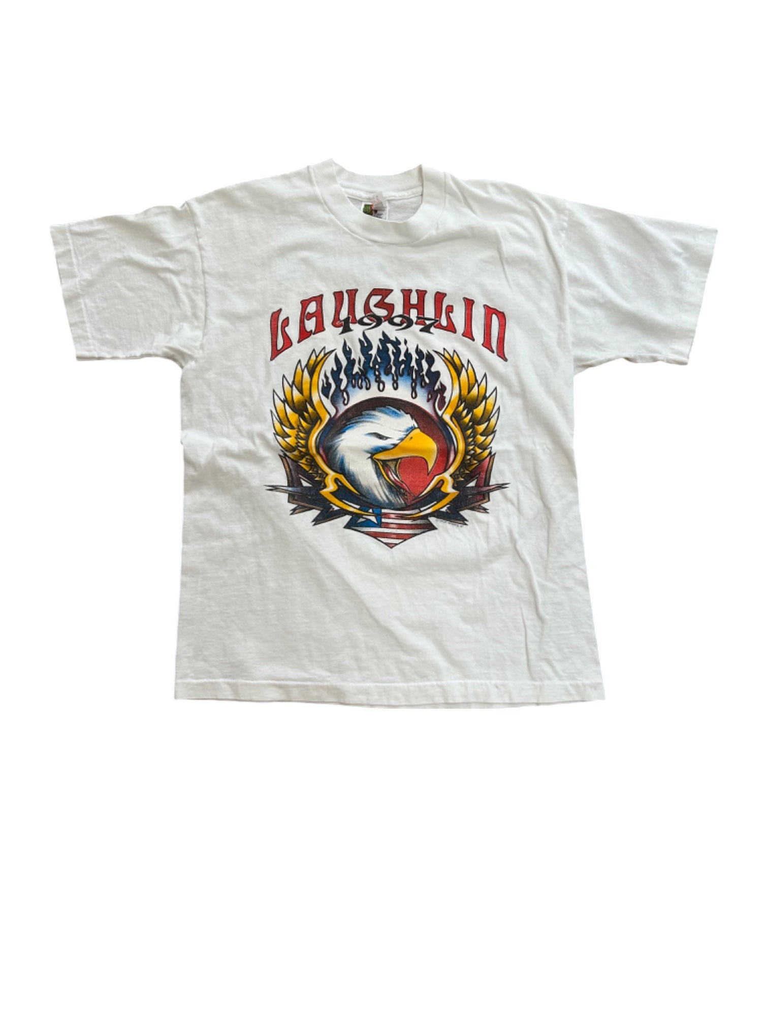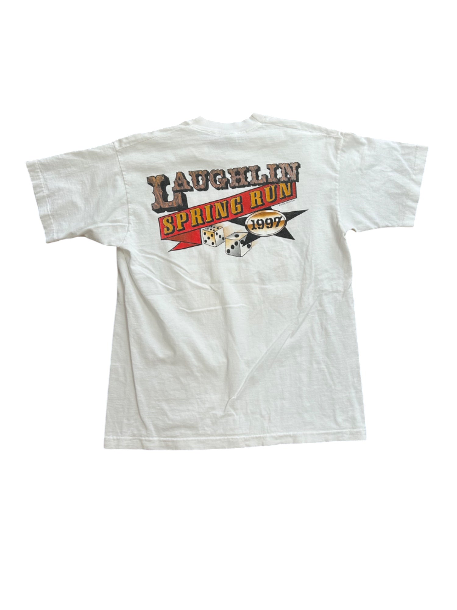 Authentic 1997 Laughlin Spring Run T-shirt featuring vivid front and back graphics. The front design showcases a bold eagle with flames and chain detail, while the back displays dice and the event banner in red, yellow, and black.