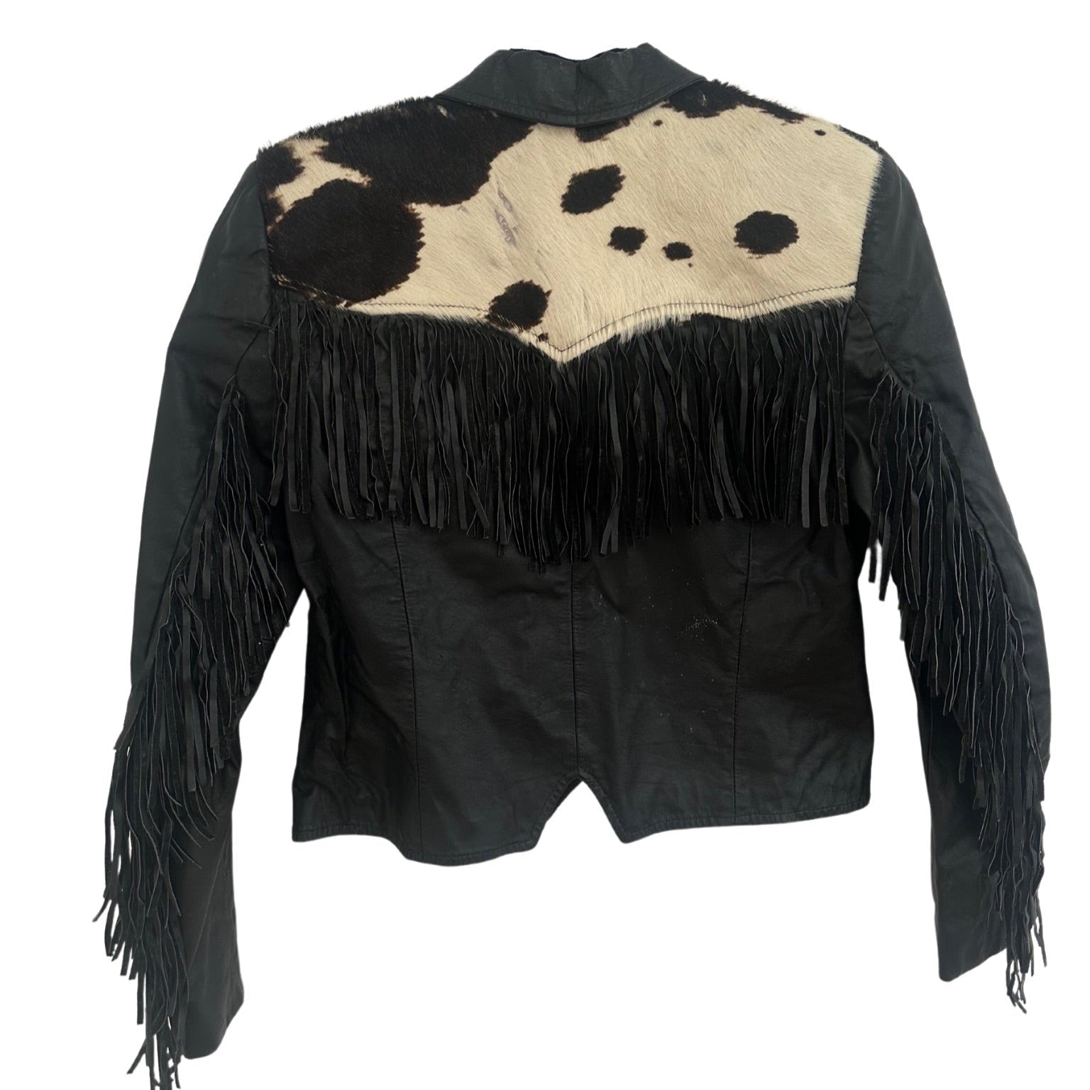 Beautiful worn in Pioneer Wear Leather and Cowhide Jacket with leather fringe embellishment
