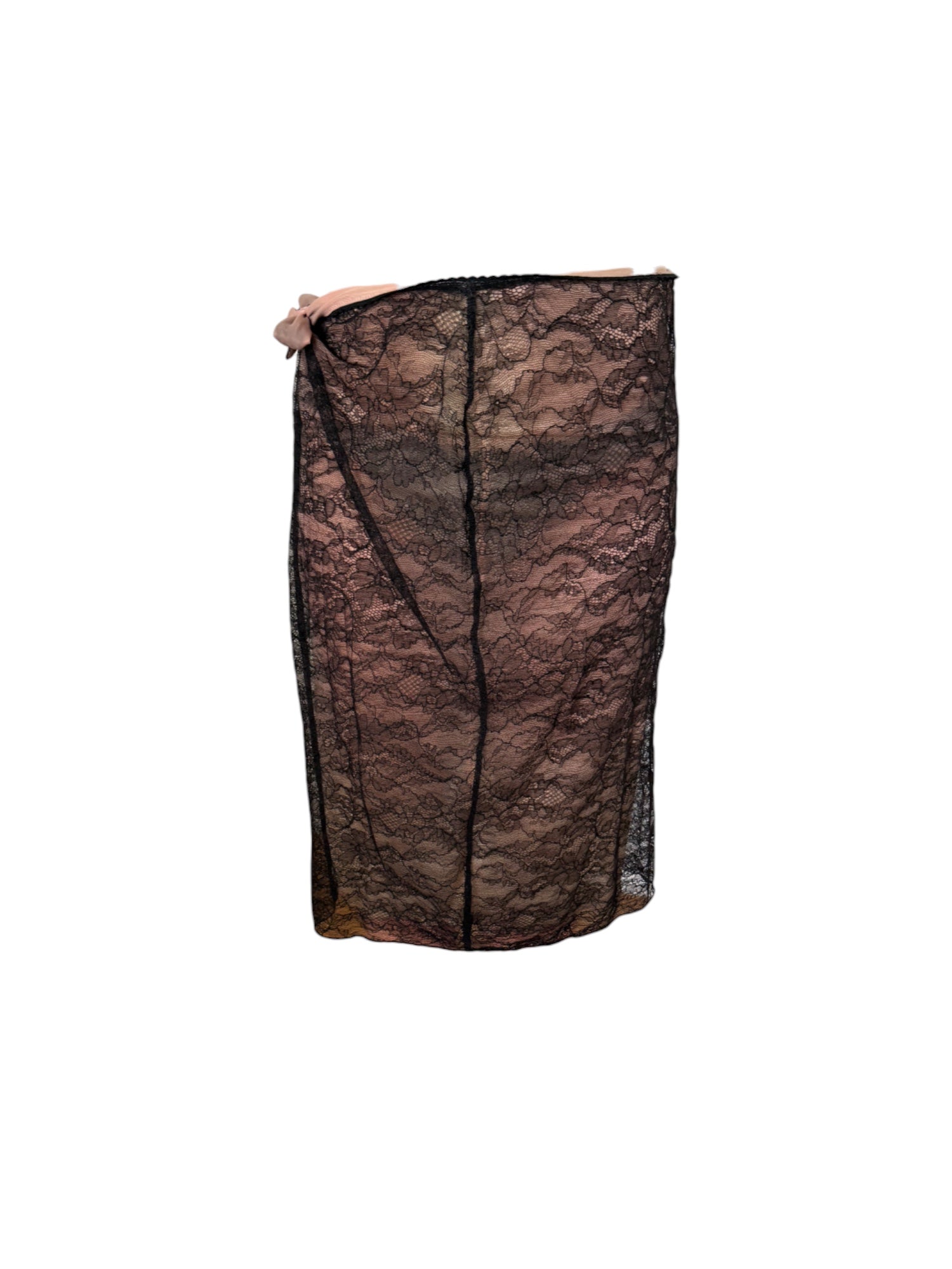 A dreamy and seductive piece from early-2000s Blumarine, this sheer lace midi skirt is all about feminine drama. Crafted in fine black floral lace layered over a soft blush pink lining, it’s finished with romantic flourishes like pink satin tie closures and delicate embroidered rose appliqués. The silhouette hugs the hips before falling into a straight cut, creating that signature Blumarine balance of soft and sultry.