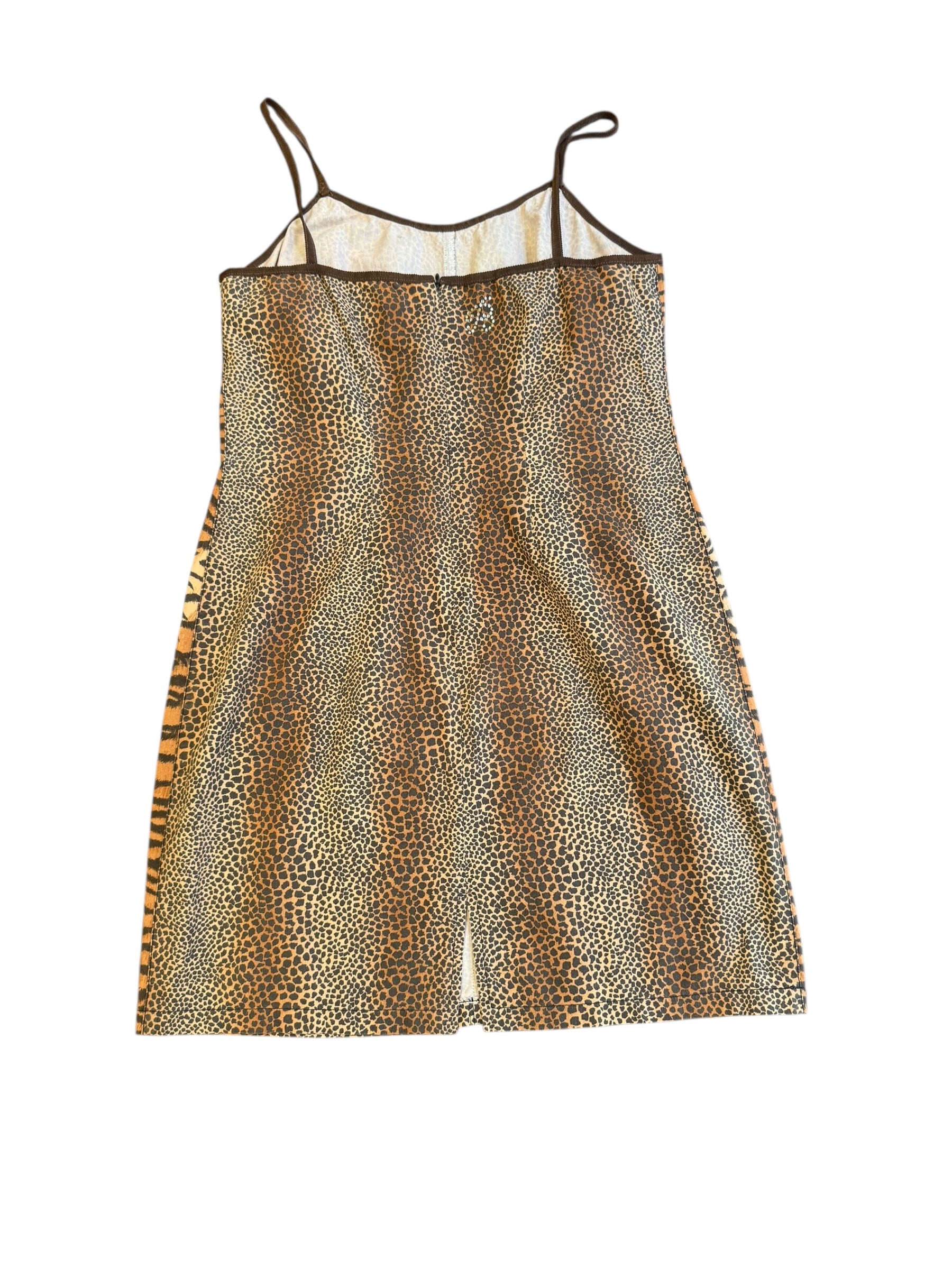 Classic Blumarine wildness — this cheetah and tiger print slip dress captures the brand’s sultry, animal-print legacy from the early 2000s. Designed in a silky stretch fabric that hugs the body just right, it features a mixed animal motif, spaghetti straps, and a subtle front slit for movement and deliberate rhinestones. Finished with delicate chocolate-brown trim, it’s the perfect piece for layering or wearing solo.