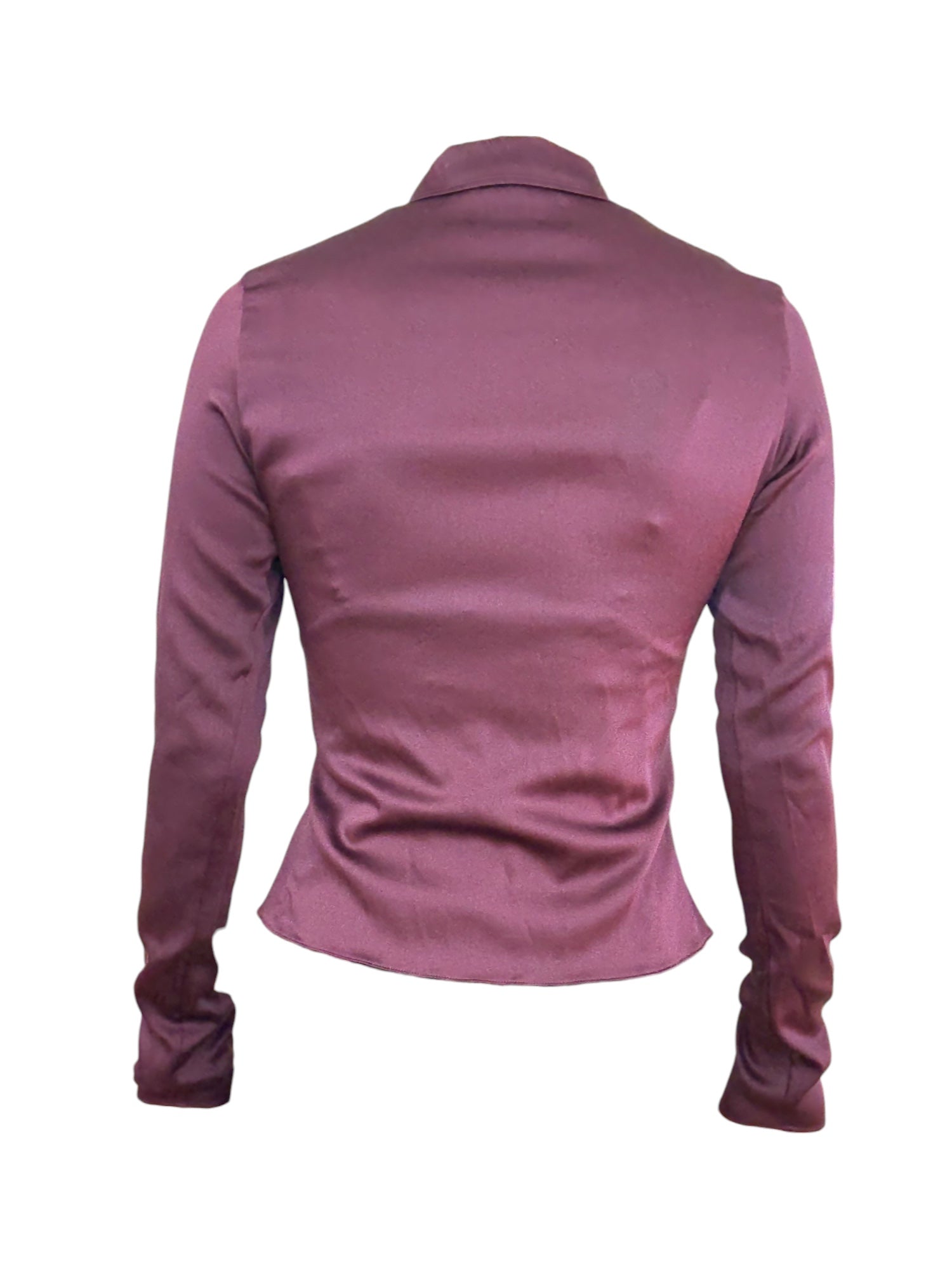 A structured and sultry classic from the Fall/Winter 2001 Christian Dior collection, designed by John Galliano during his legendary tenure. This rich burgundy long-sleeve polo is crafted from a luxurious silk-elastane blend, offering a fluid drape with a subtle stretch that molds to the body.
