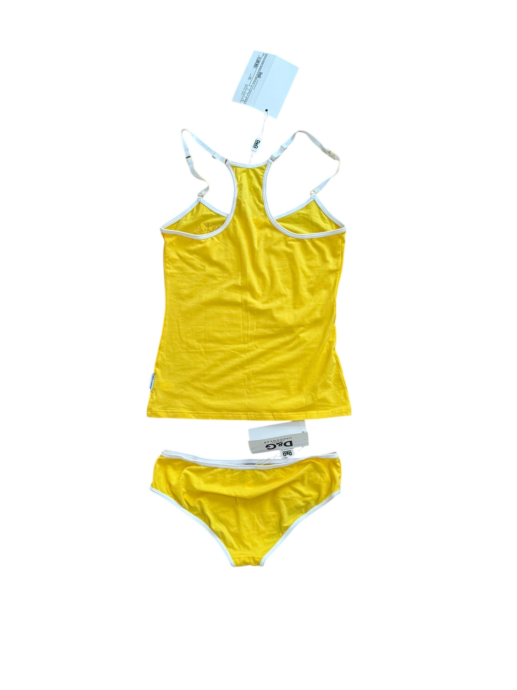 Serve early-2000s sweetness in this rare Y2K Dolce & Gabbana lingerie-style set. The vibrant lemon-yellow cotton blend pops with contrast white trim and cherry-red accents. Featuring a cute cherry graphic and bold “D&G Sweet Flavour” slogan, this playful set channels the cheeky energy of iconic 2000s pop culture.