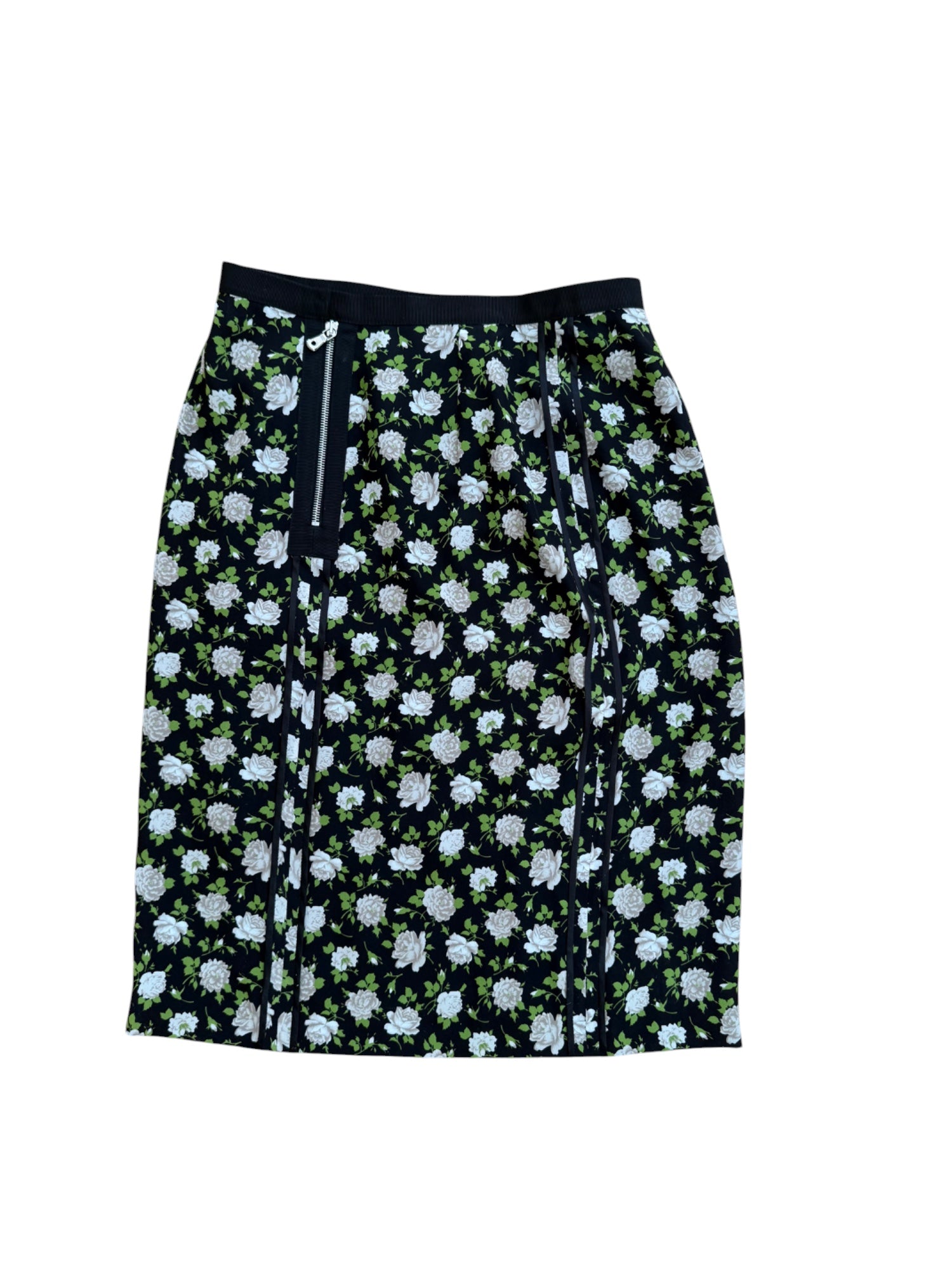 A sleek, sporty twist on florals from vintage Dolce & Gabbana. This pencil skirt features a classic high-rise silhouette with crisp white rose print over black technical stretch fabric. Vertical grosgrain trim and exposed silver zippers add a utilitarian, almost moto vibe — unexpected and very D&G. Feels like an editorial moment with serious off-duty cool.