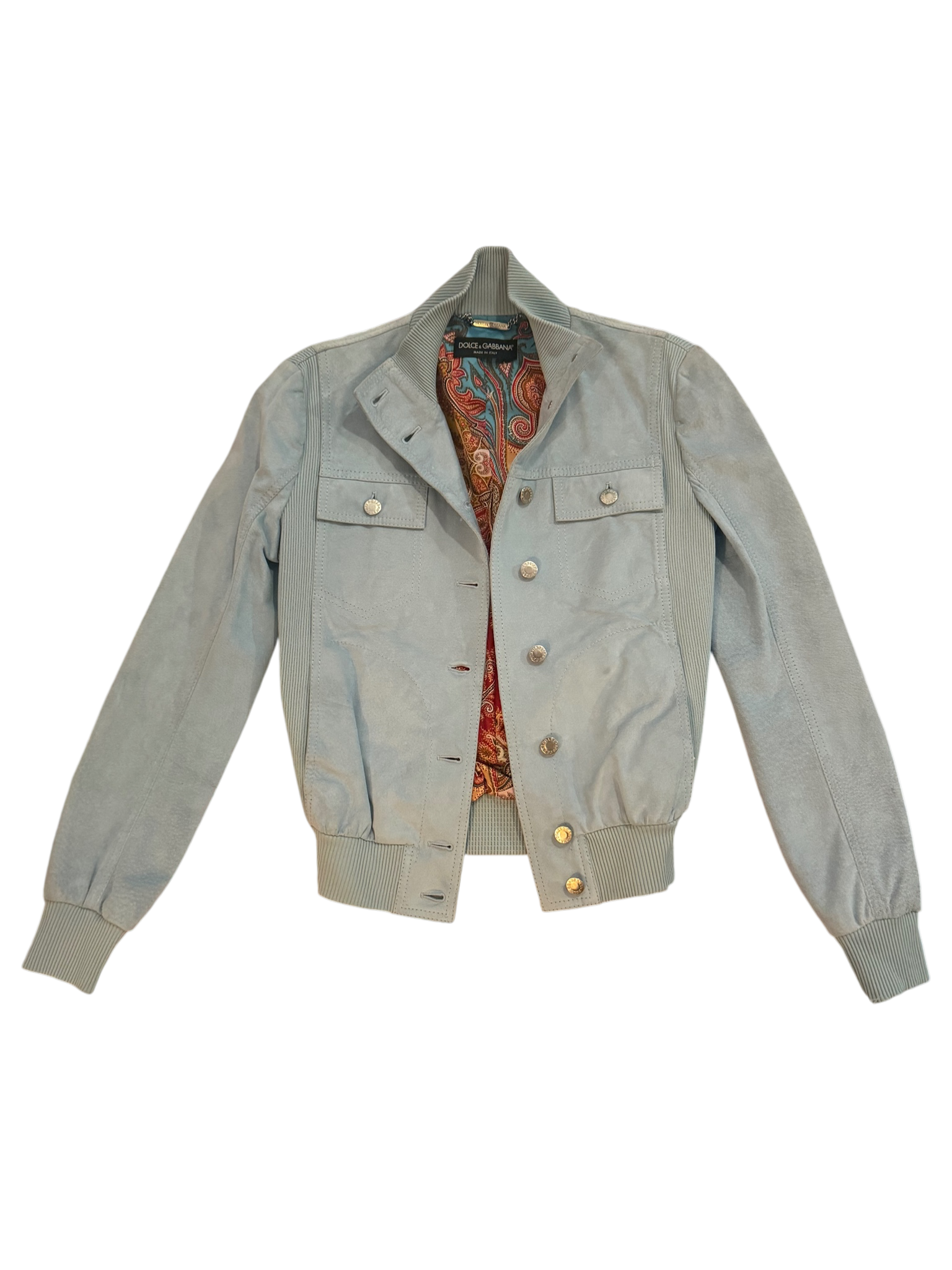 Inside, a vibrant paisley lining adds a bold contrast and unmistakable Dolce energy. Finished with branded metal buttons and flap chest pockets, this piece balances casual sport influence with refined luxury construction.