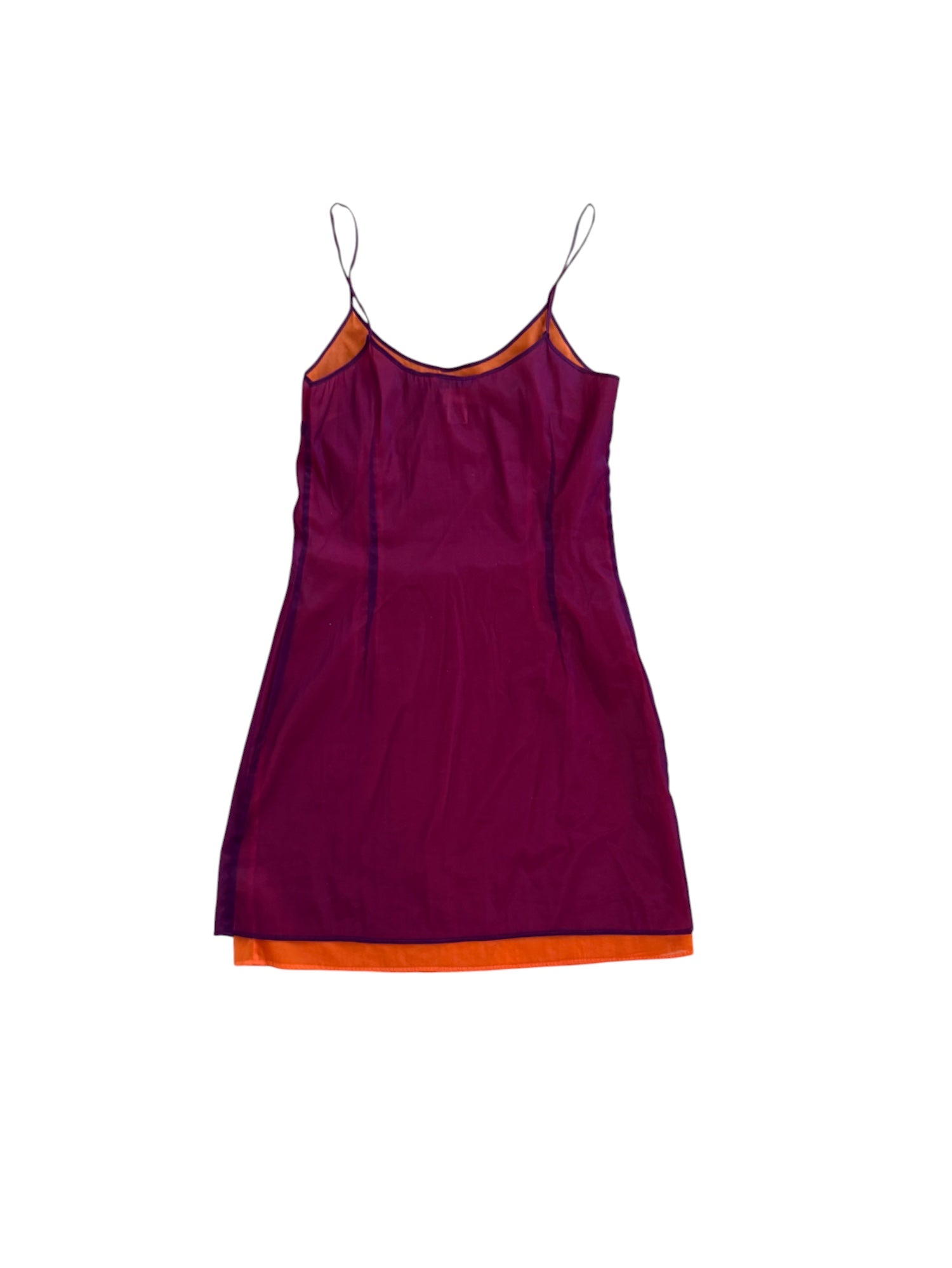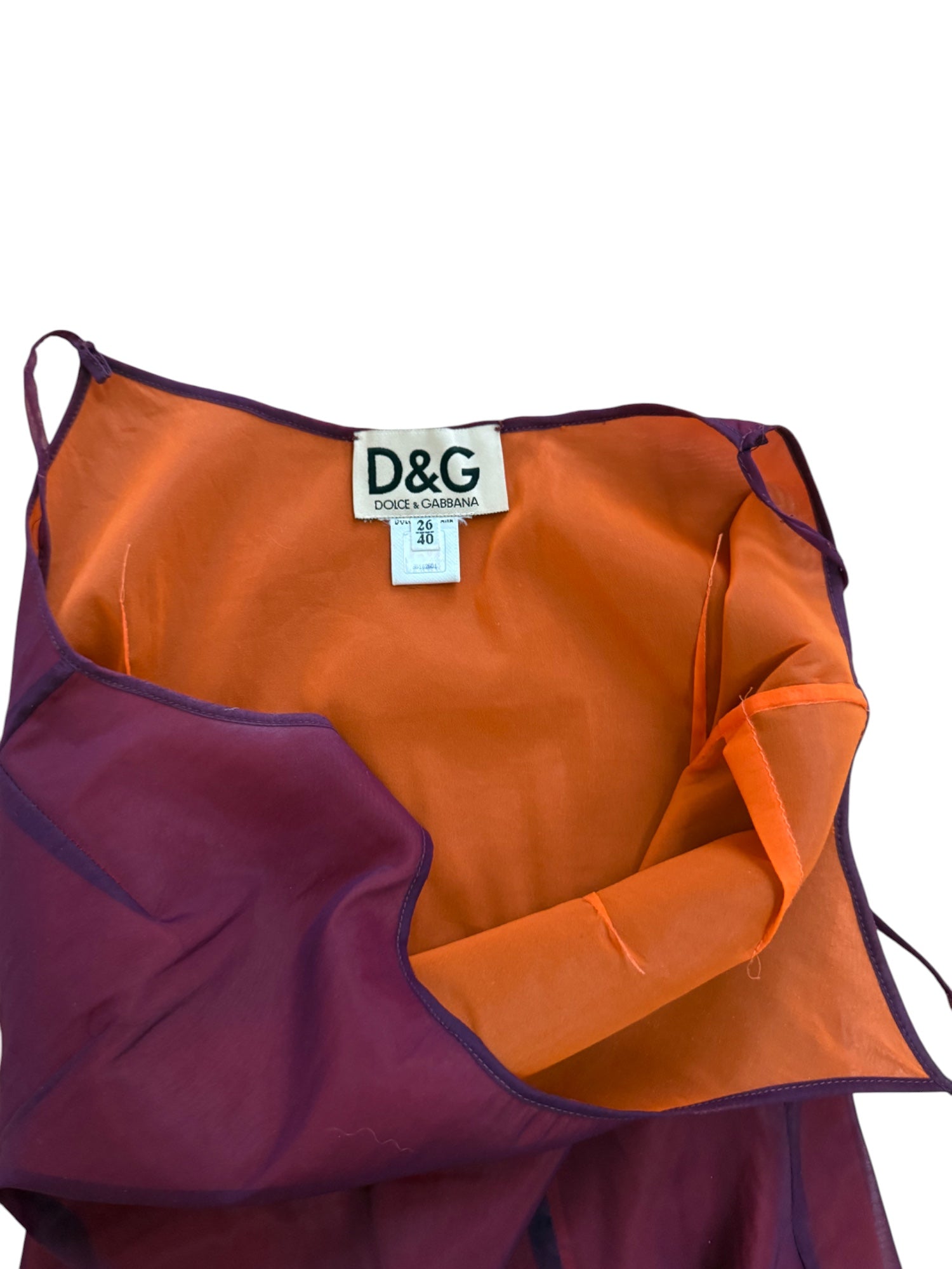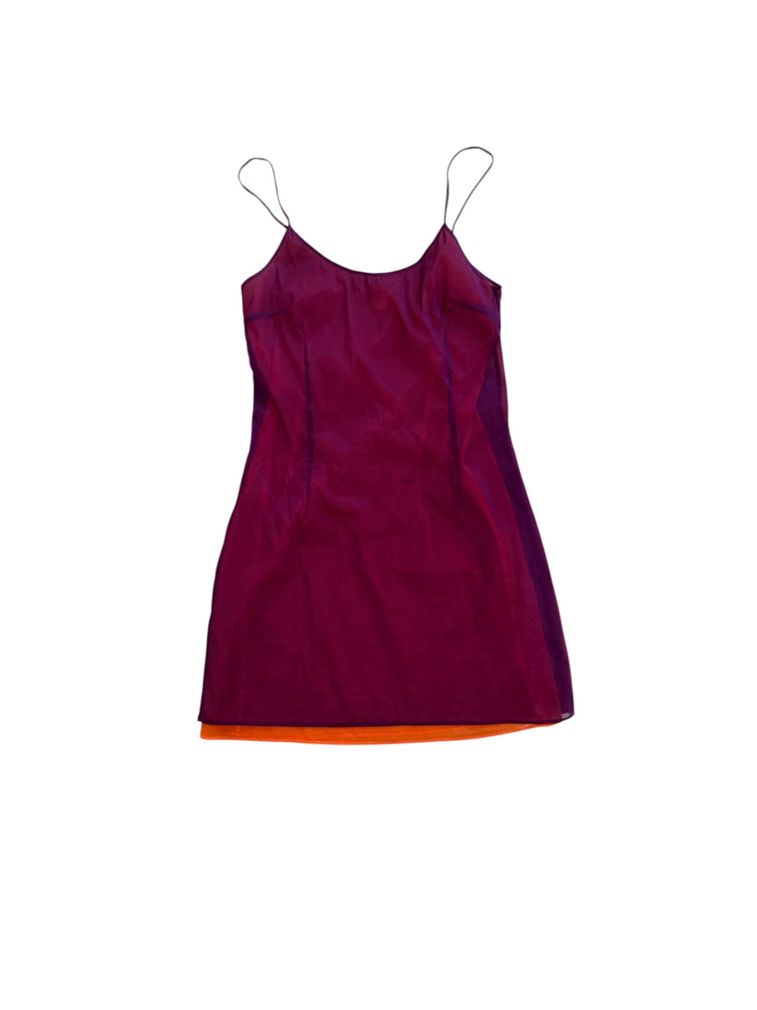 A striking piece from the golden era of '90s Dolce & Gabbana, this ultra-lightweight mesh slip dress embodies the minimal, sensual energy of the decade. Crafted in a sheer plum overlay with a vibrant orange interior lining, this piece plays with color, light, and movement for an effortlessly sultry silhouette.