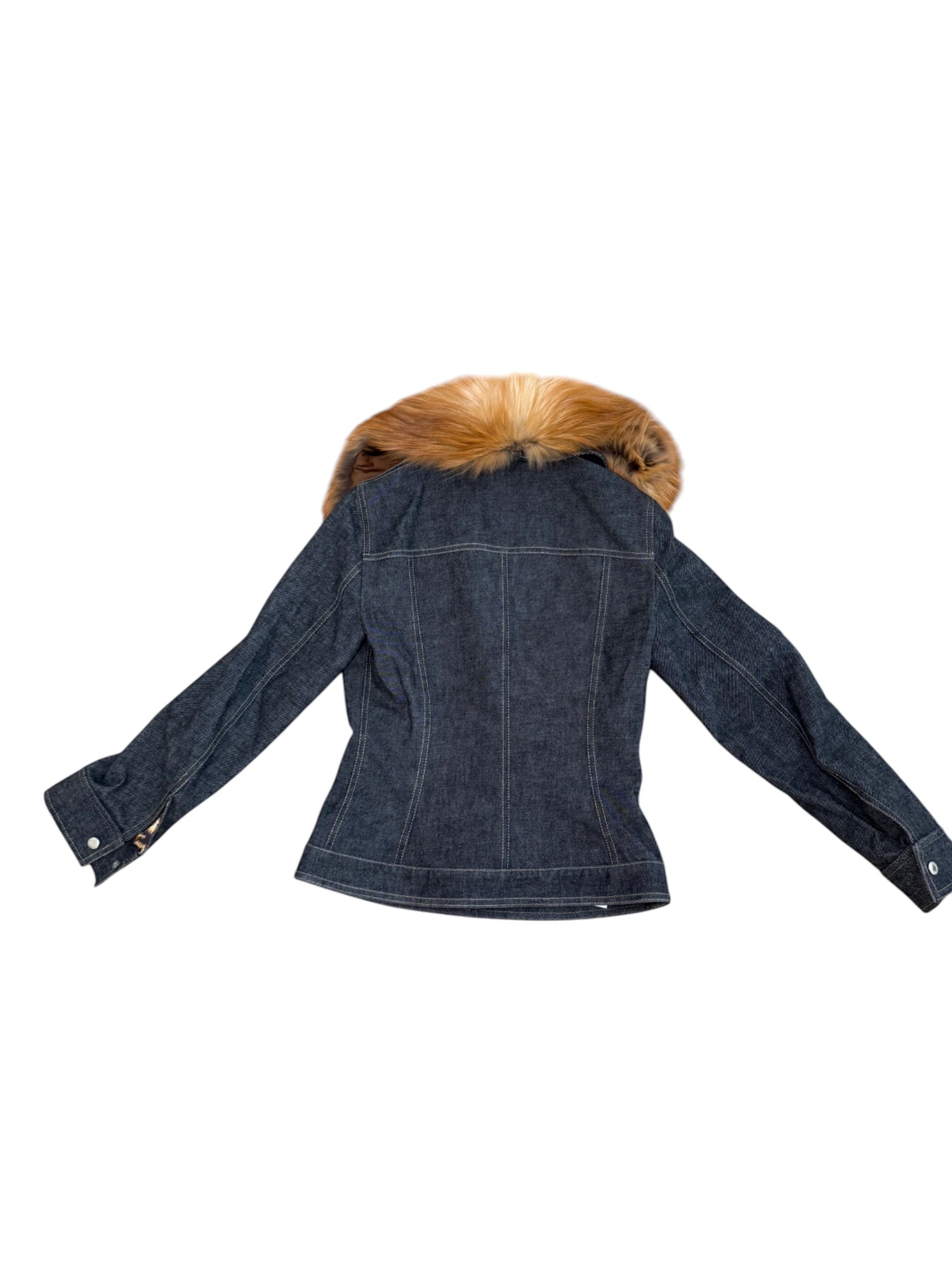 An iconic piece from Dolce & Gabbana’s late ’90s–early 2000s collections, this vintage denim jacket features a structured, feminine silhouette finished with a dramatic removable fox fur collar in rich amber tones. With contrast stitching, flap chest pockets, and a snap-front closure, this piece merges utility with luxe vintage edge.