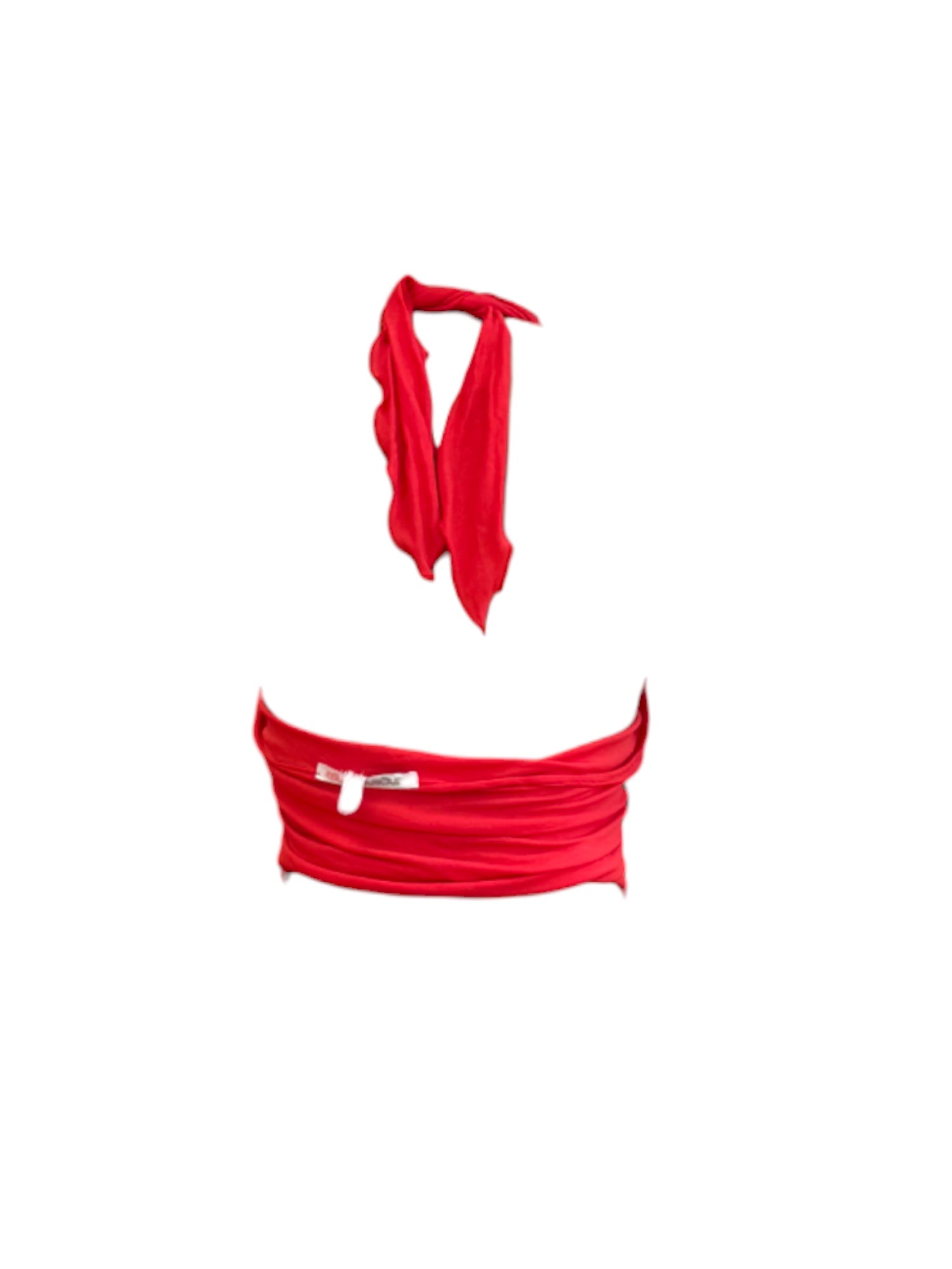 A head-turning essential from the house of Emanuel Ungaro, this fiery mesh halter top brings classic French seduction to the Y2K era. With its gathered front, plunging neckline, and vivid hue, this piece is pure drama—perfect for nights that start with champagne and end with sunrise.