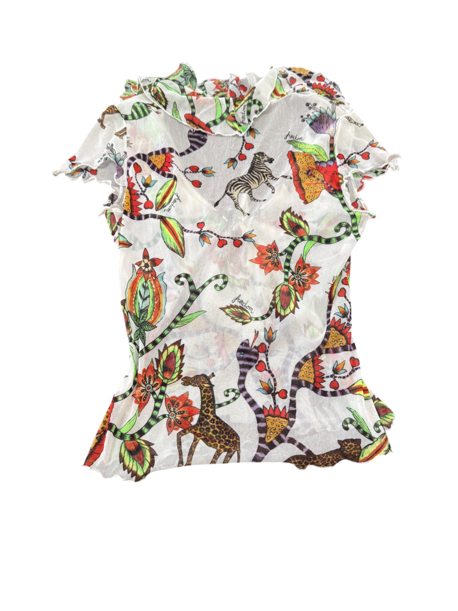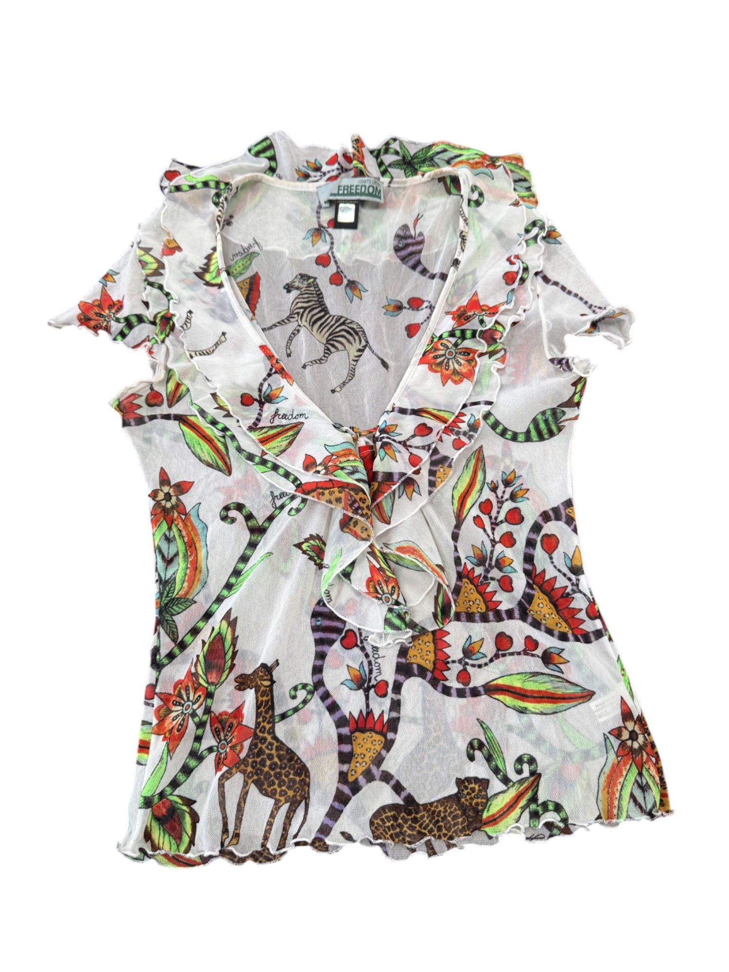 Take a walk on the wild side with this vibrant Freedom by Roberto Cavalli top, bursting with bold jungle energy. Covered in colorful zebras, giraffes, cheetahs, and florals, this sheer mesh piece is the perfect mix of playful and sultry—signature Cavalli.