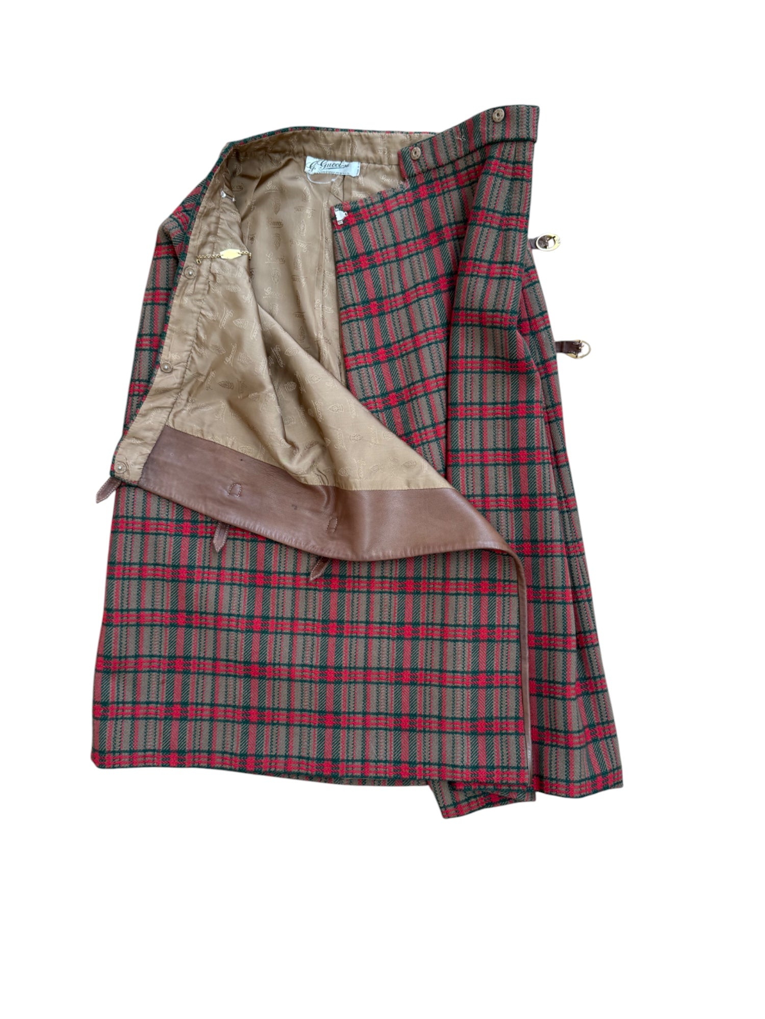A timeless piece from Gucci's heritage collection, this vintage wool kilt skirt channels classic preppy elegance with Italian craftsmanship. Featuring a rich red, green, and tan plaid, this skirt is constructed from structured wool with a full silky Gucci monogram lining. The asymmetric wrap silhouette is secured with three leather side buckles in rich brown, adding dimension and vintage edge.