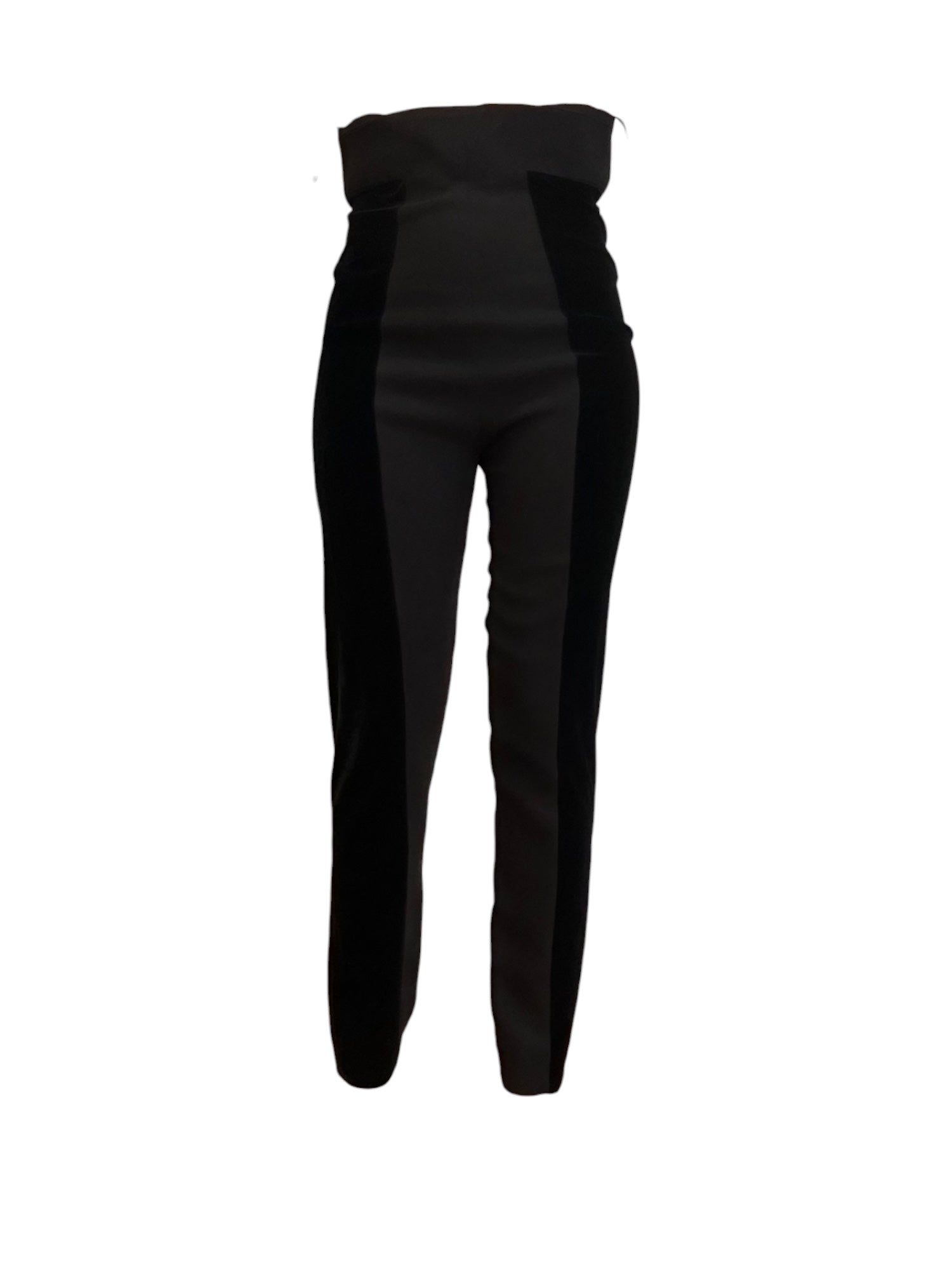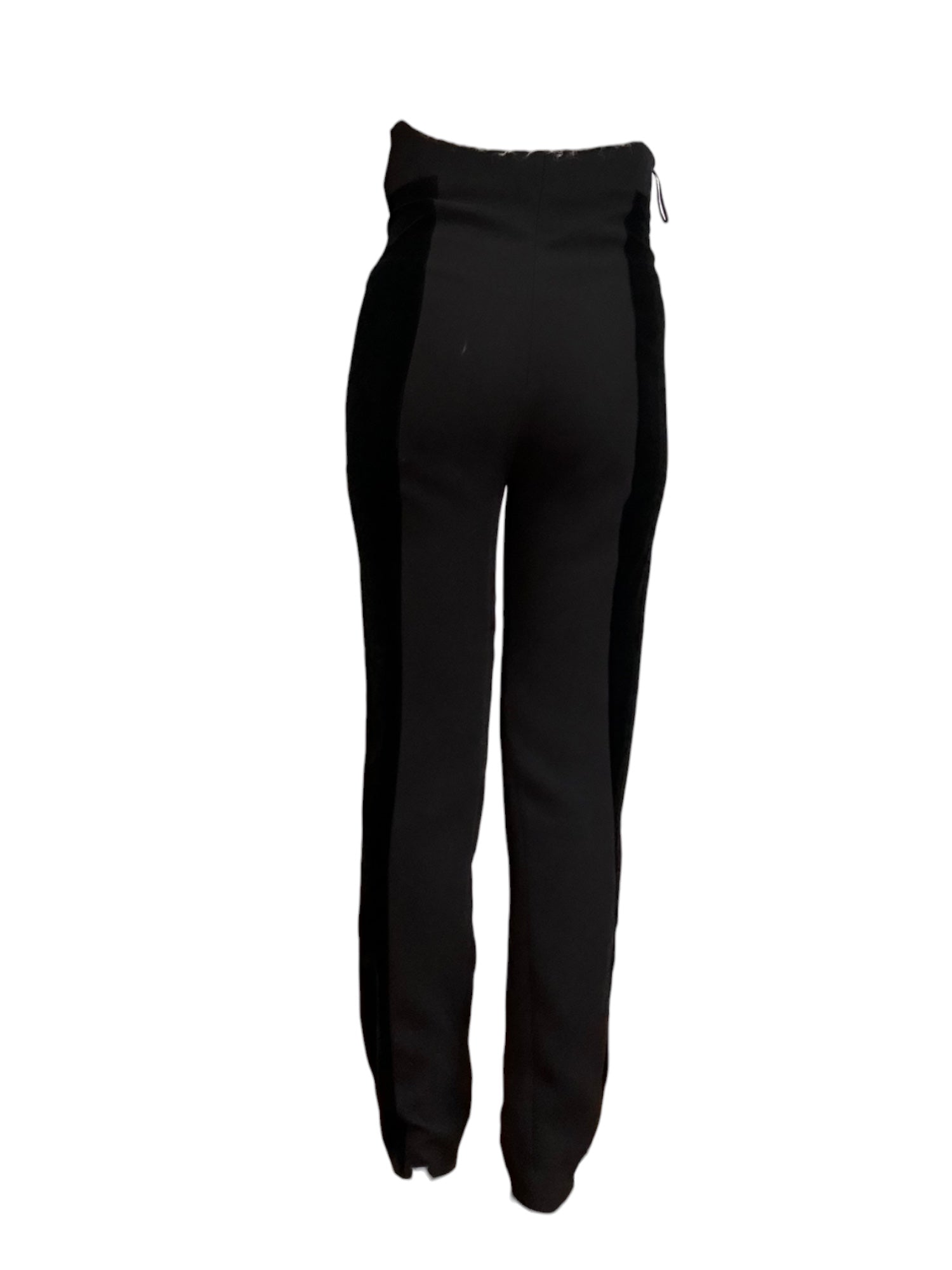 Sleek and sculptural, these vintage Jean Paul Gaultier Femme pants are crafted from a structured triacetate and polyester blend that holds its shape beautifully. Featuring a flattering high-rise silhouette with wide velvet-paneled sides that elongate the leg, they zip up the back for a seamless finish. An elevated take on classic black trousers, perfect for statement suiting or dressing up with a corset top.