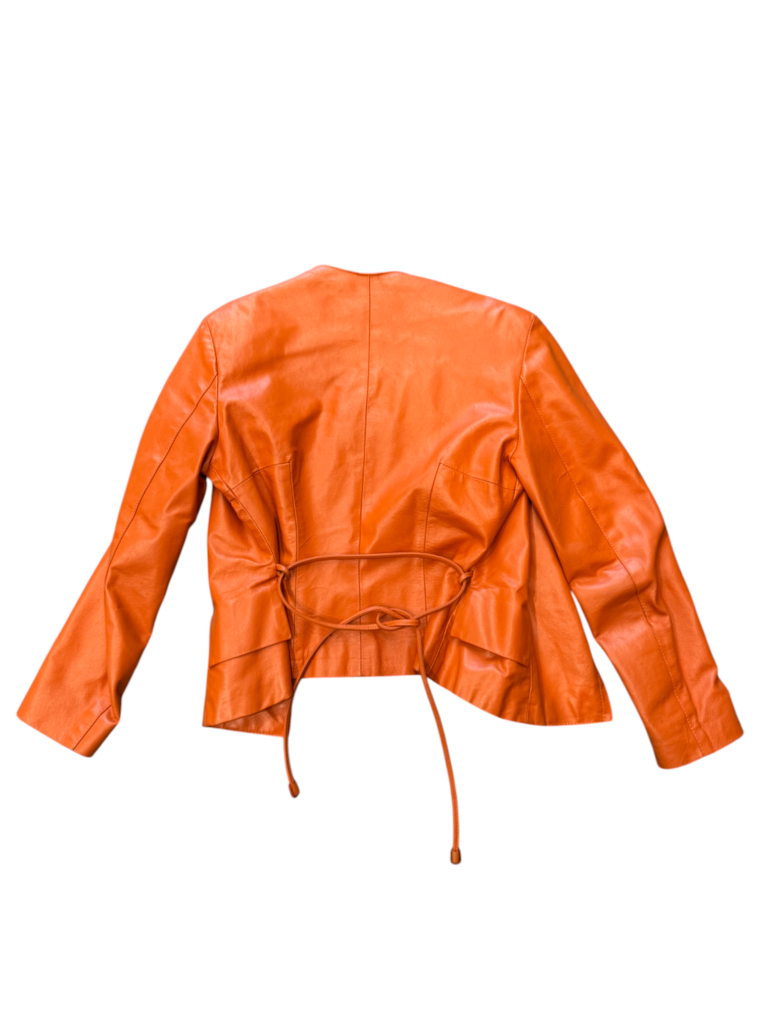 A statement piece in bold orange leather, designed with a sleek minimal collar and asymmetrical front zip closure. Featuring structured seaming, flap pockets, and an adjustable tie-back cinch for a custom fit, this jacket combines modern edge with refined tailoring. Fully lined for comfort and a smooth finish, it’s the perfect standout layer to elevate both day and evening looks.