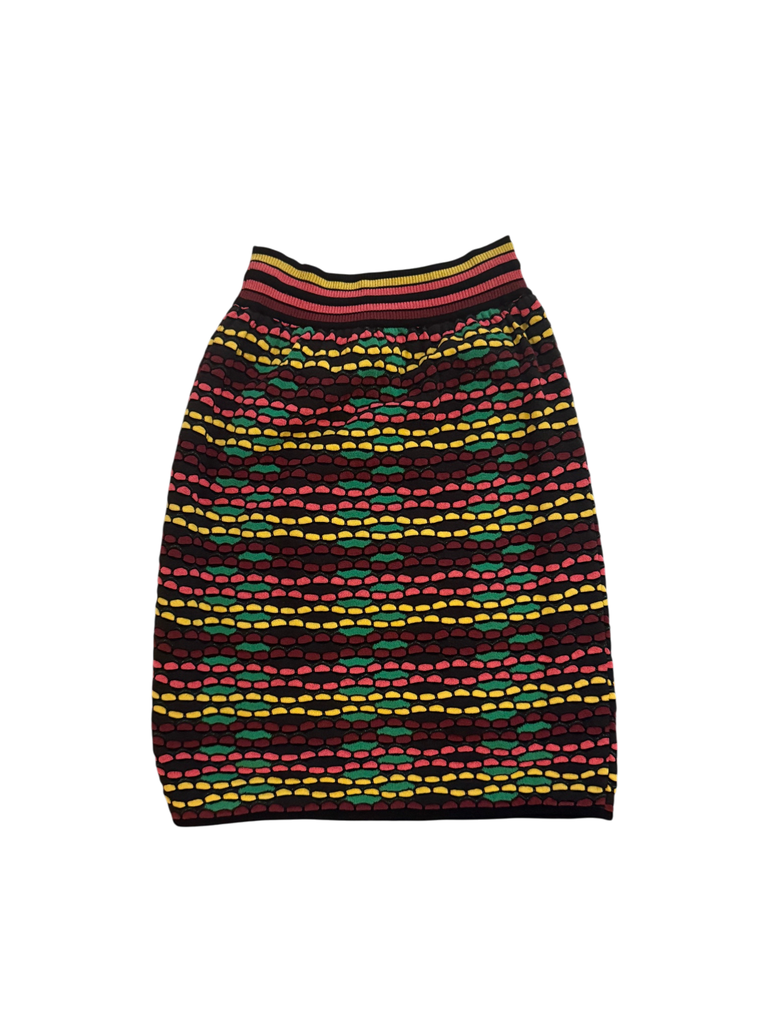 Vibrant vintage Missoni knit skirt featuring the house’s signature playful colorwork and dimensional texture. The design showcases horizontal rows of raised knit dots in rich tones of red, yellow, green, and deep burgundy set against a dark base. A ribbed waistband with subtle striping adds contrast and structure, while the slightly tapered silhouette creates a flattering shape.