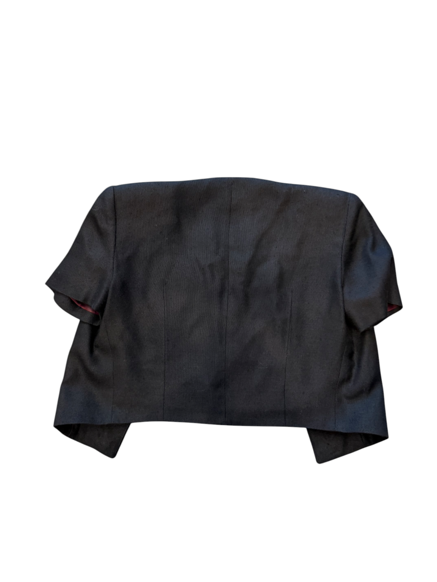 A rare and playful vintage gem from Moschino’s Cheap and Chic line. This tailored cropped jacket is crafted in sleek black fabric with a smooth burgundy lining, finished with short sleeves and clean seaming for a structured fit. The standout detail is its whimsical gold-tone bicycle buttons, a signature Moschino twist on classic tailoring.
