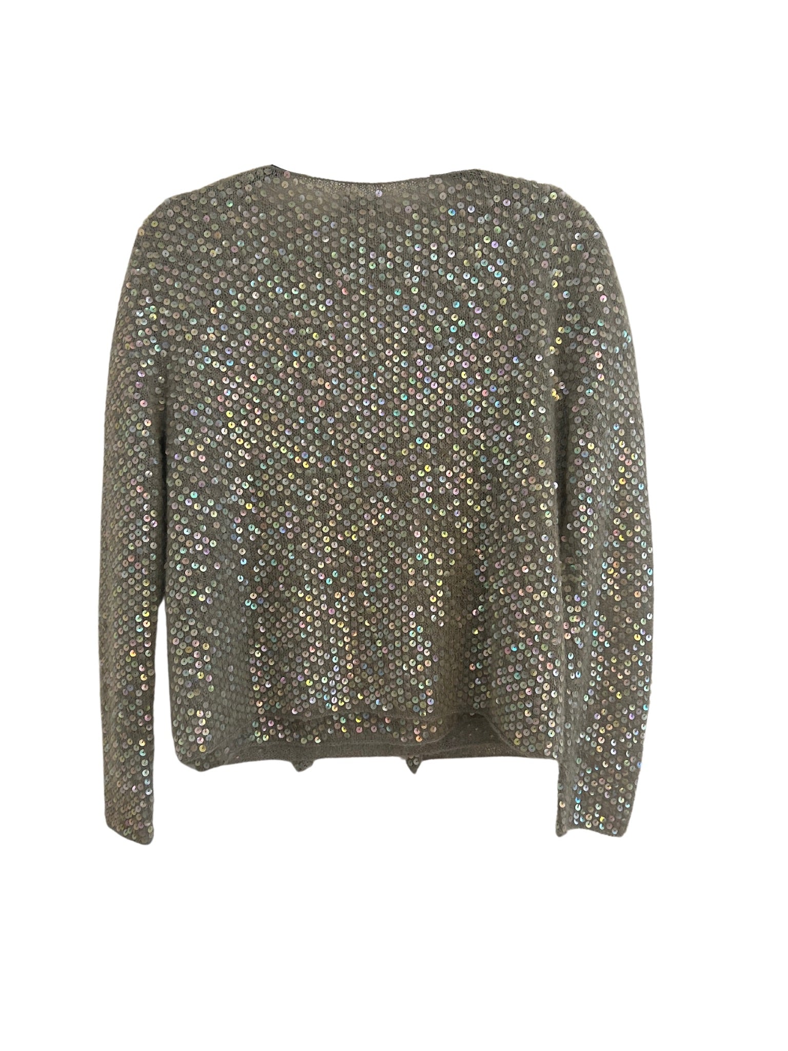 Bring all the shimmer with this rare vintage Moschino twin set, fully embellished with iridescent sequins on a soft mohair blend. The set includes a sleeveless scoop-neck shell and a matching cardigan with snap-button closure. Worn together or separately, this Y2K dream channels party-girl polish with Moschino’s signature playful edge.