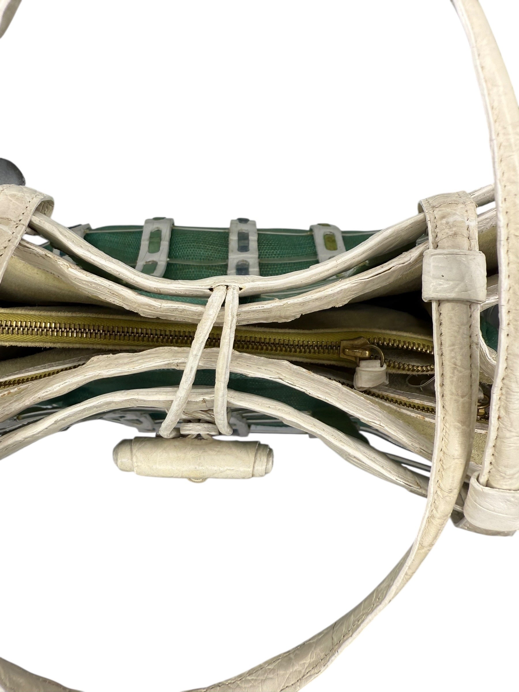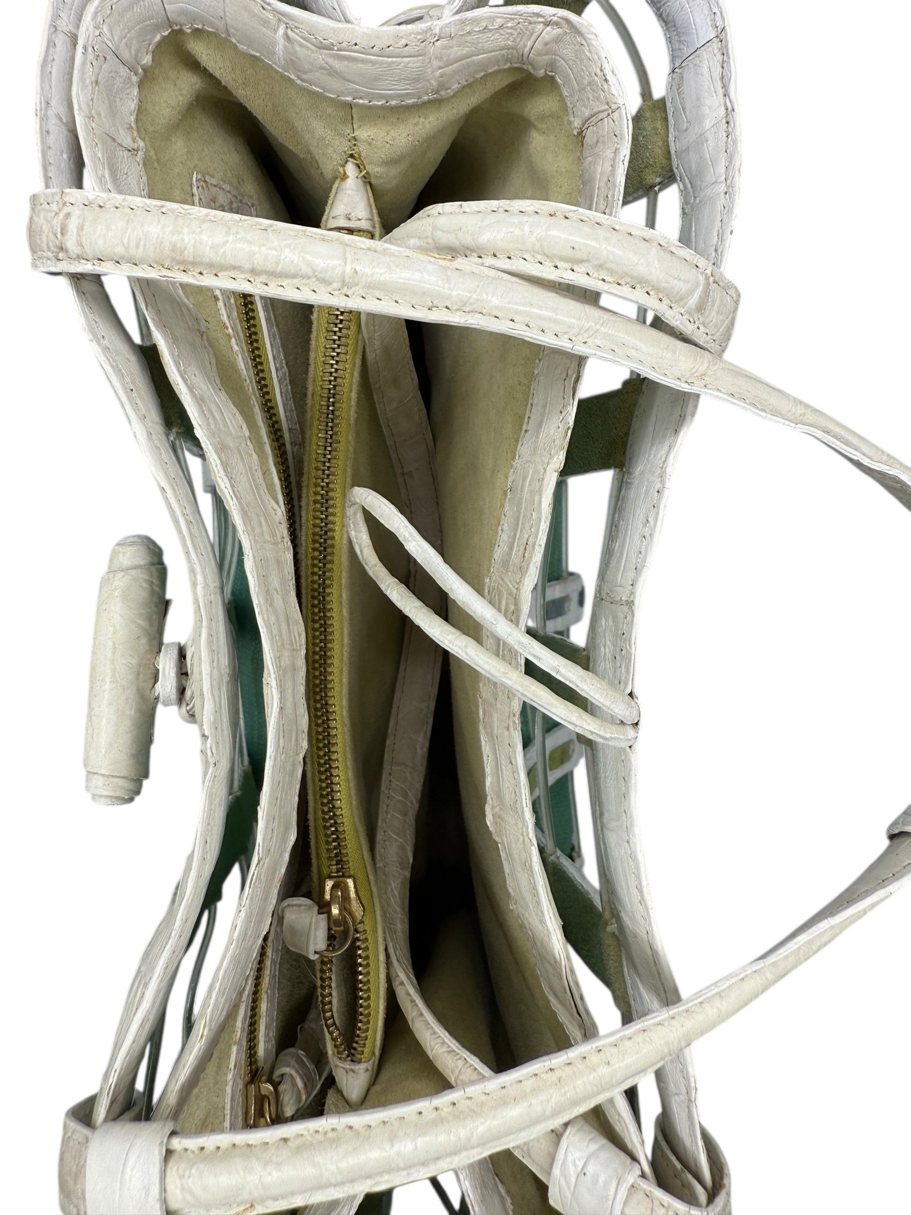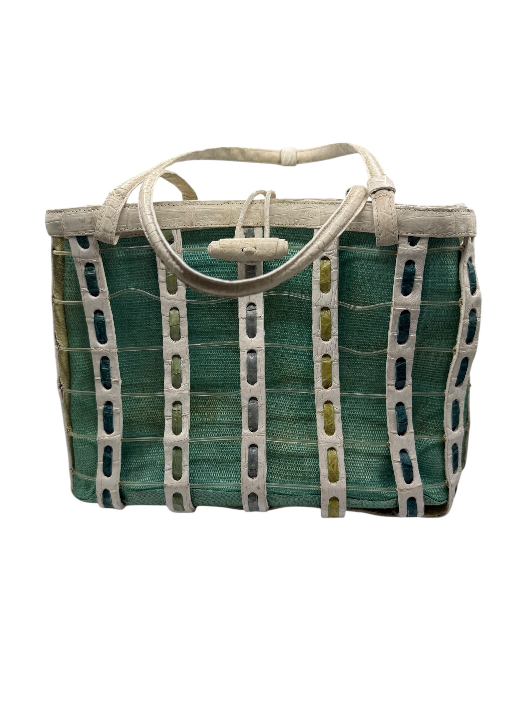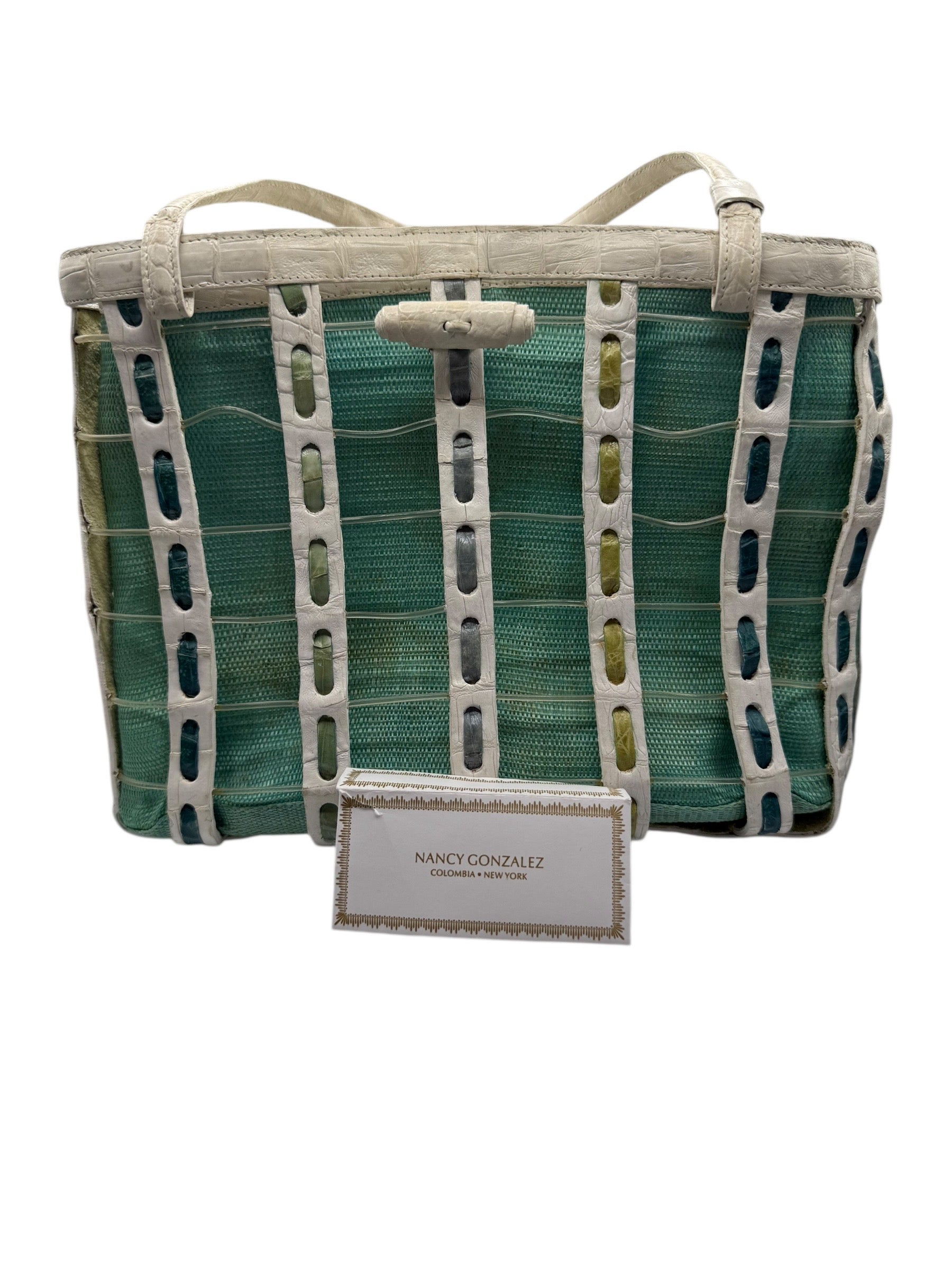 A strikingly sculptural piece from Colombian luxury designer Nancy Gonzalez, this tote is an extraordinary blend of artisanal craftsmanship and bold design. Featuring a mint green woven body encased in textured white crocodile leather trim, the bag is accented with vertical leather panels stitched with colorful cut-outs in tones of blue, olive, and chartreuse, adding dimension and movement.