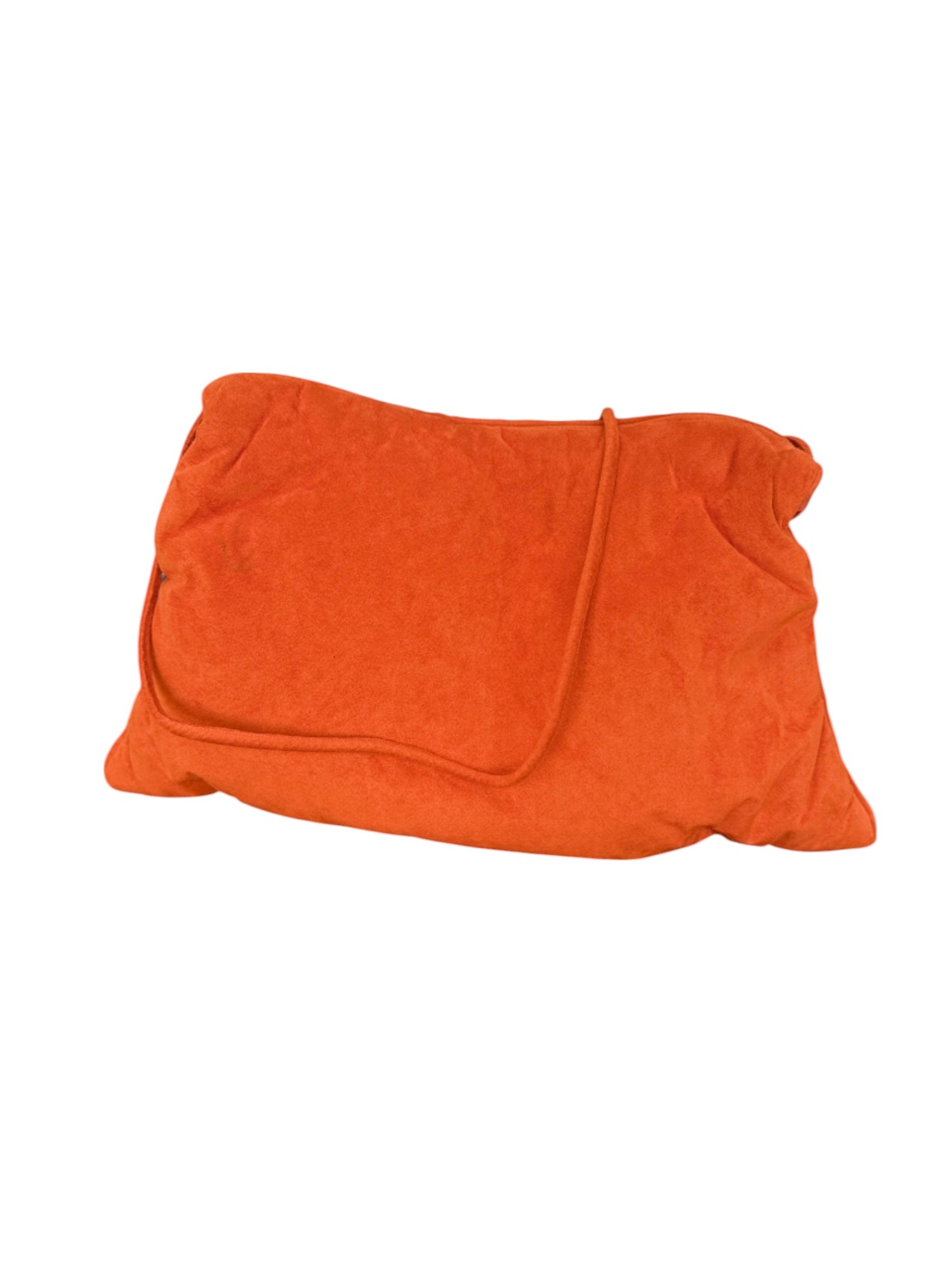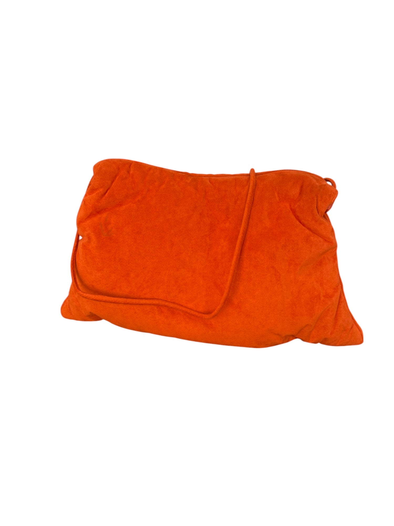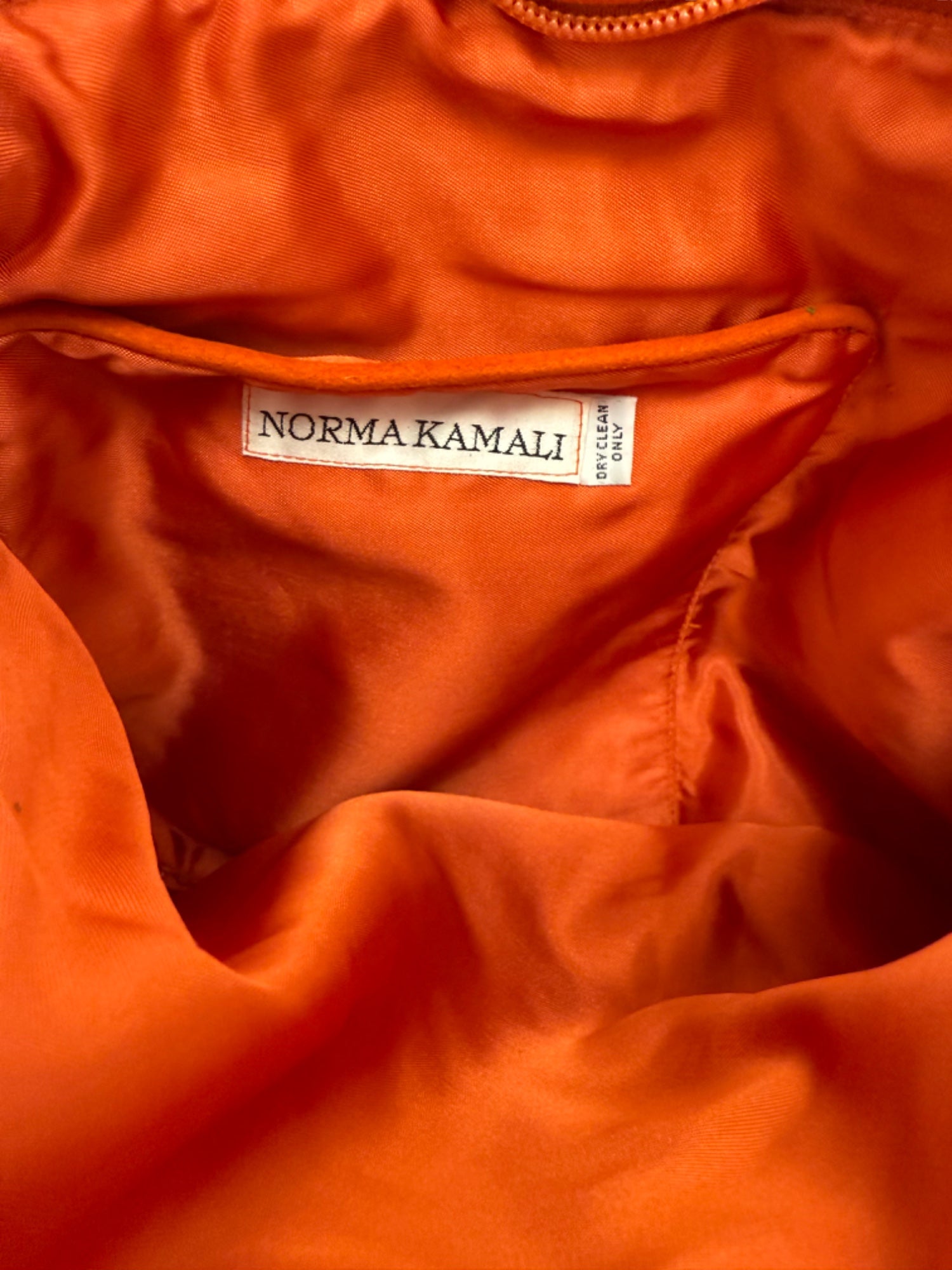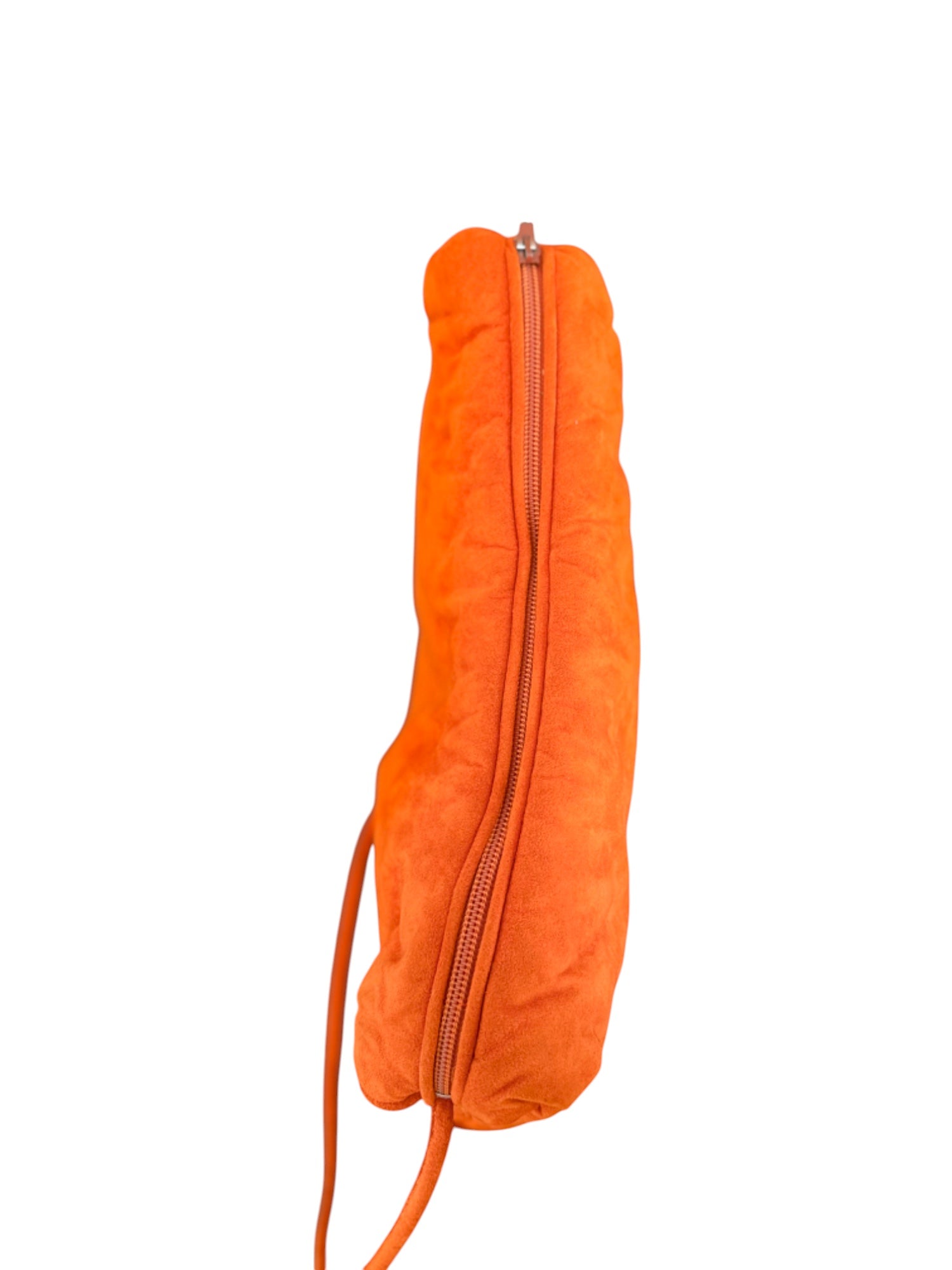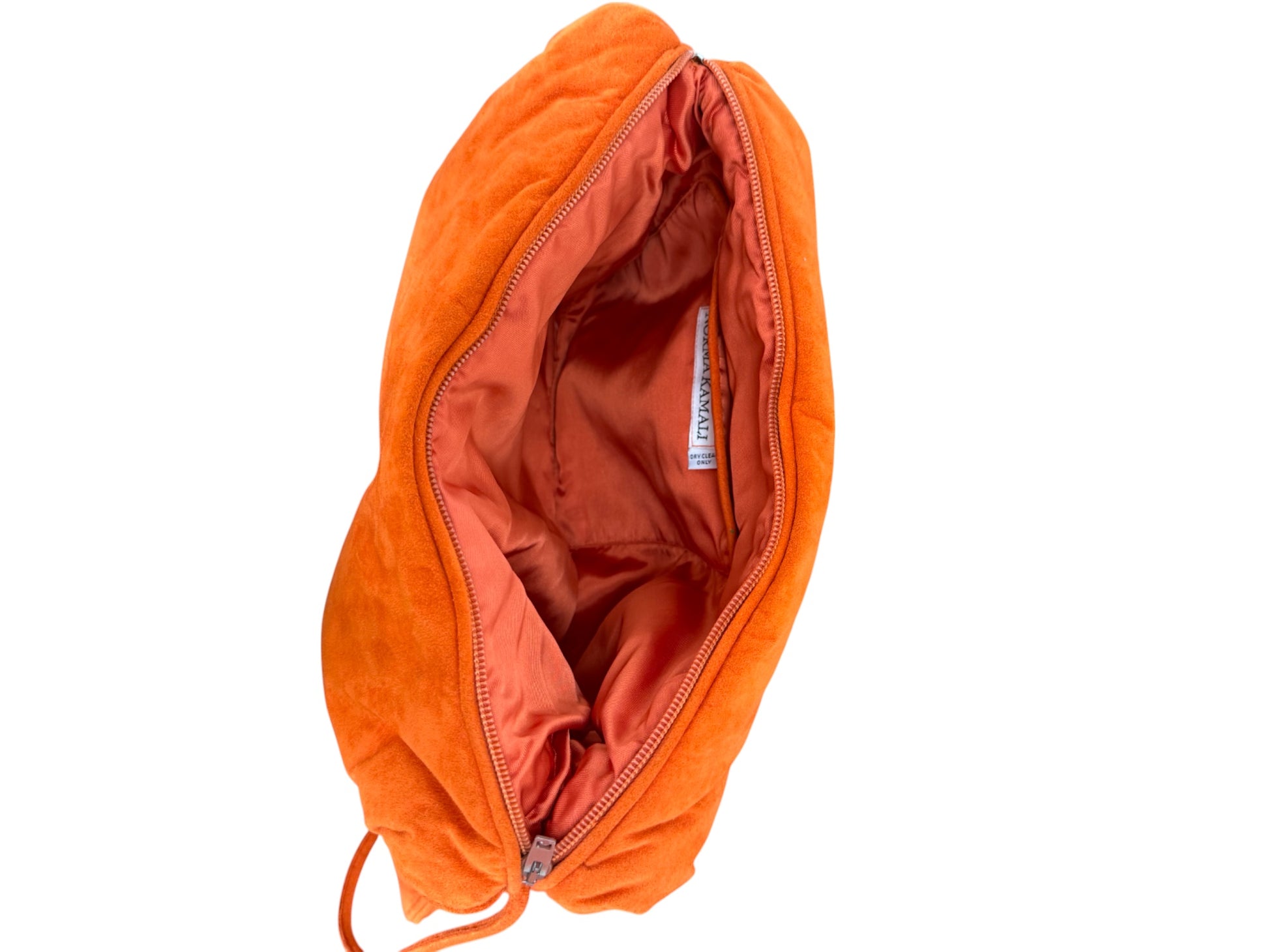 A bold archival piece from the legendary Norma Kamali, this oversized shoulder bag captures the playful sophistication of 1980s fashion. Crafted in vibrant orange vegan suede, it features sleek tonal hardware, a minimalist silhouette, and a spacious interior—perfect for turning heads while carrying it all.