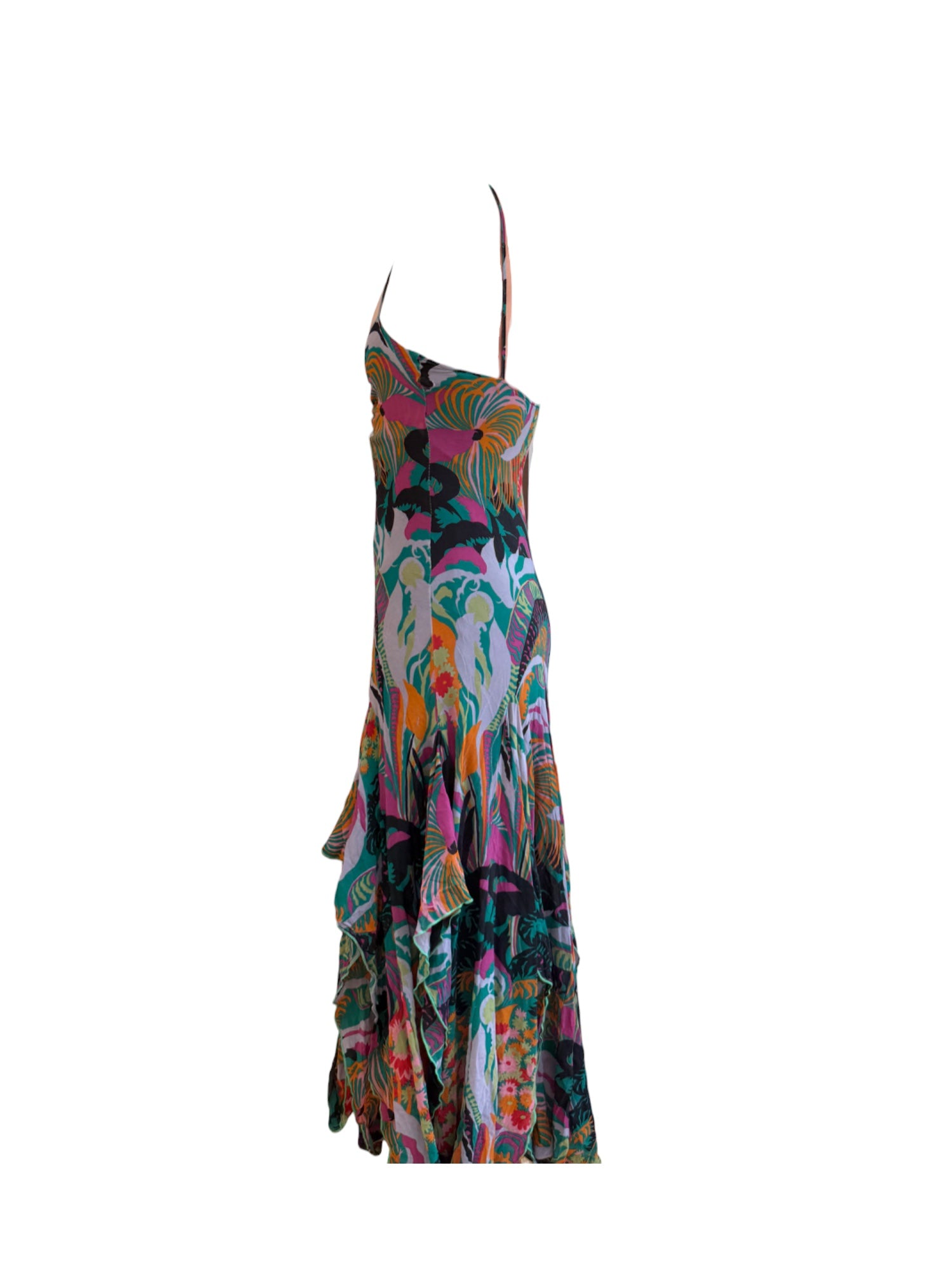 Turn heads and capture the essence of summer with this striking Roccobarocco silk dress, a rare vintage gem that blends Italian glamour with tropical flair. Crafted from luxuriously lightweight 100% silk, this dress drapes effortlessly over the body, creating a fluid silhouette that moves with you.