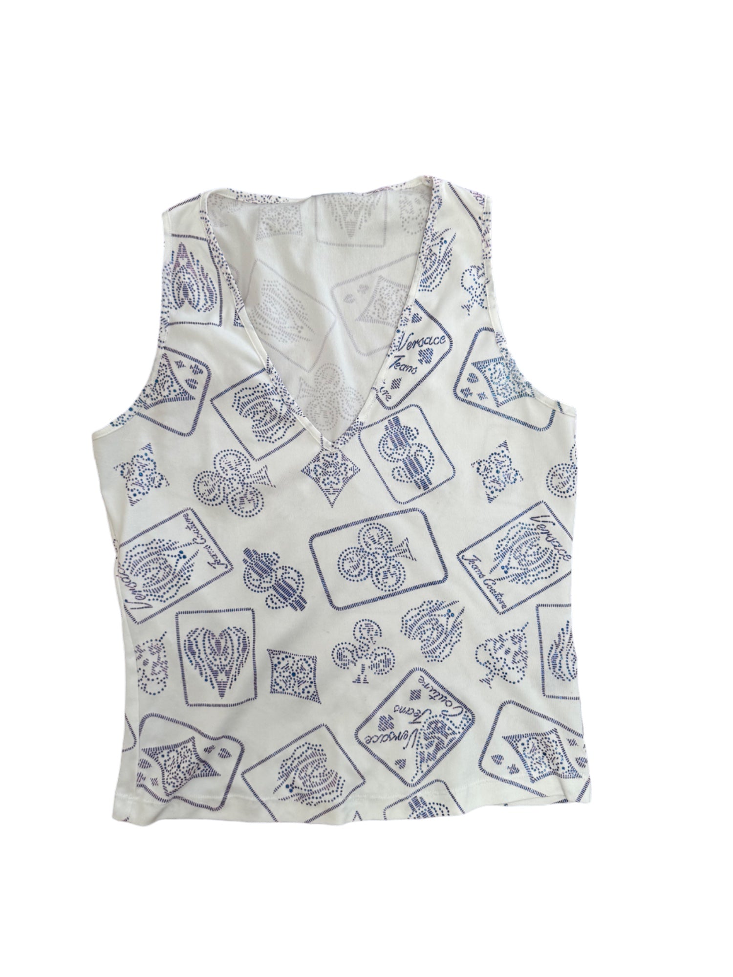 Play your fashion cards right with this ultra-rare vintage Versace Jeans Couture sleeveless top, featuring a whimsical casino-inspired allover print in a crisp blue and white palette.